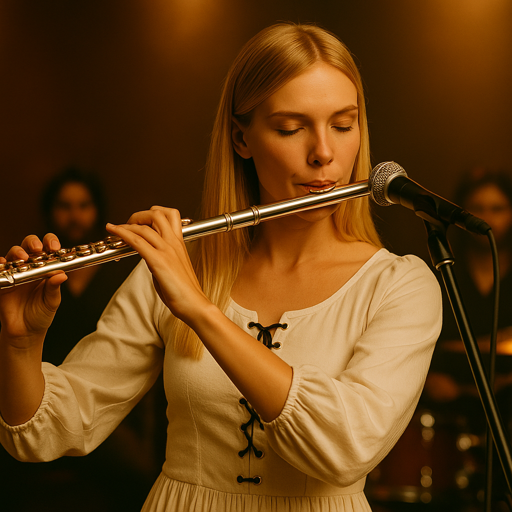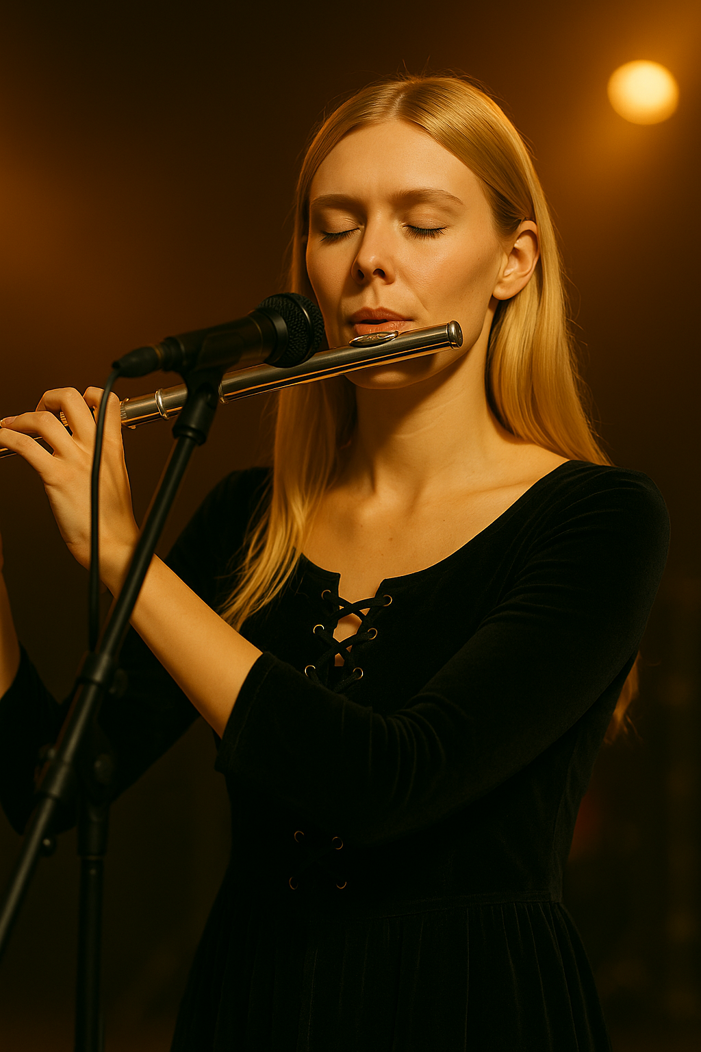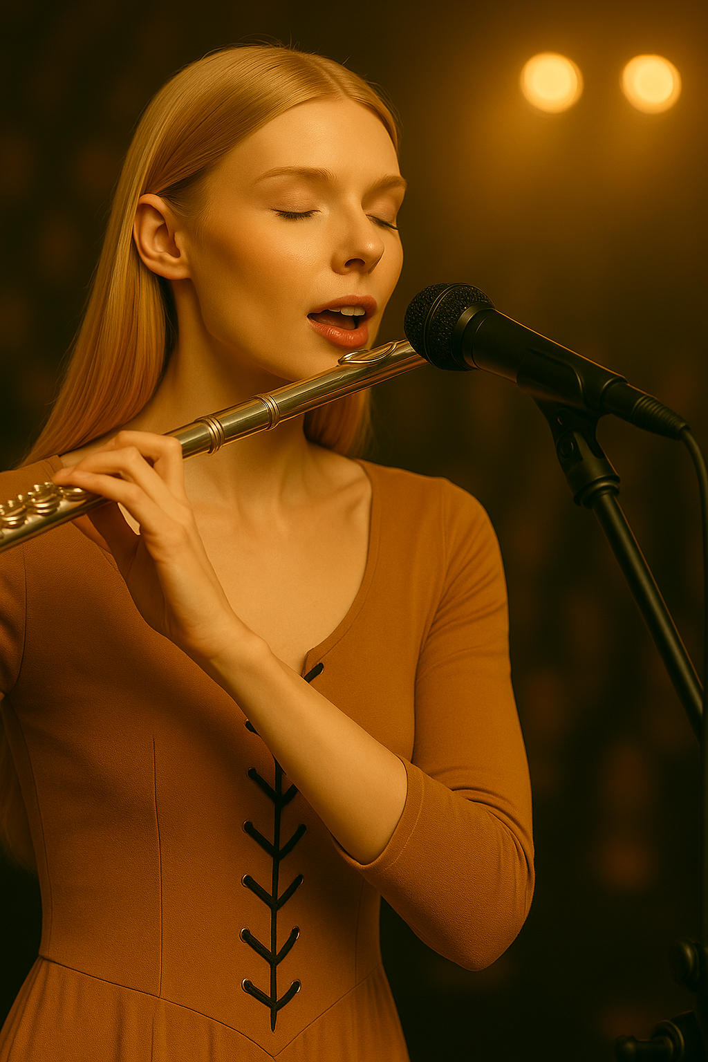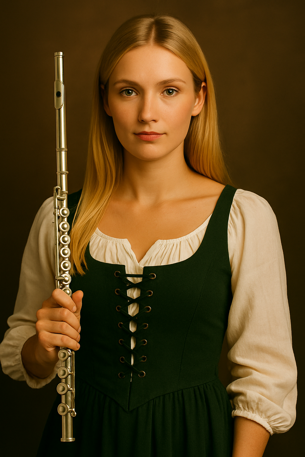 Eva plays flute and sings in Jouste. Her harmony vocals with Ludze, Geoffrey and Nigel can be heard throughout Rise Of The Red King. She also sings lead vocals on Her Majesty's Blues, Pt.1 and The Battle Is One while being featured in Swords Of War and No Battles, Nevermore.