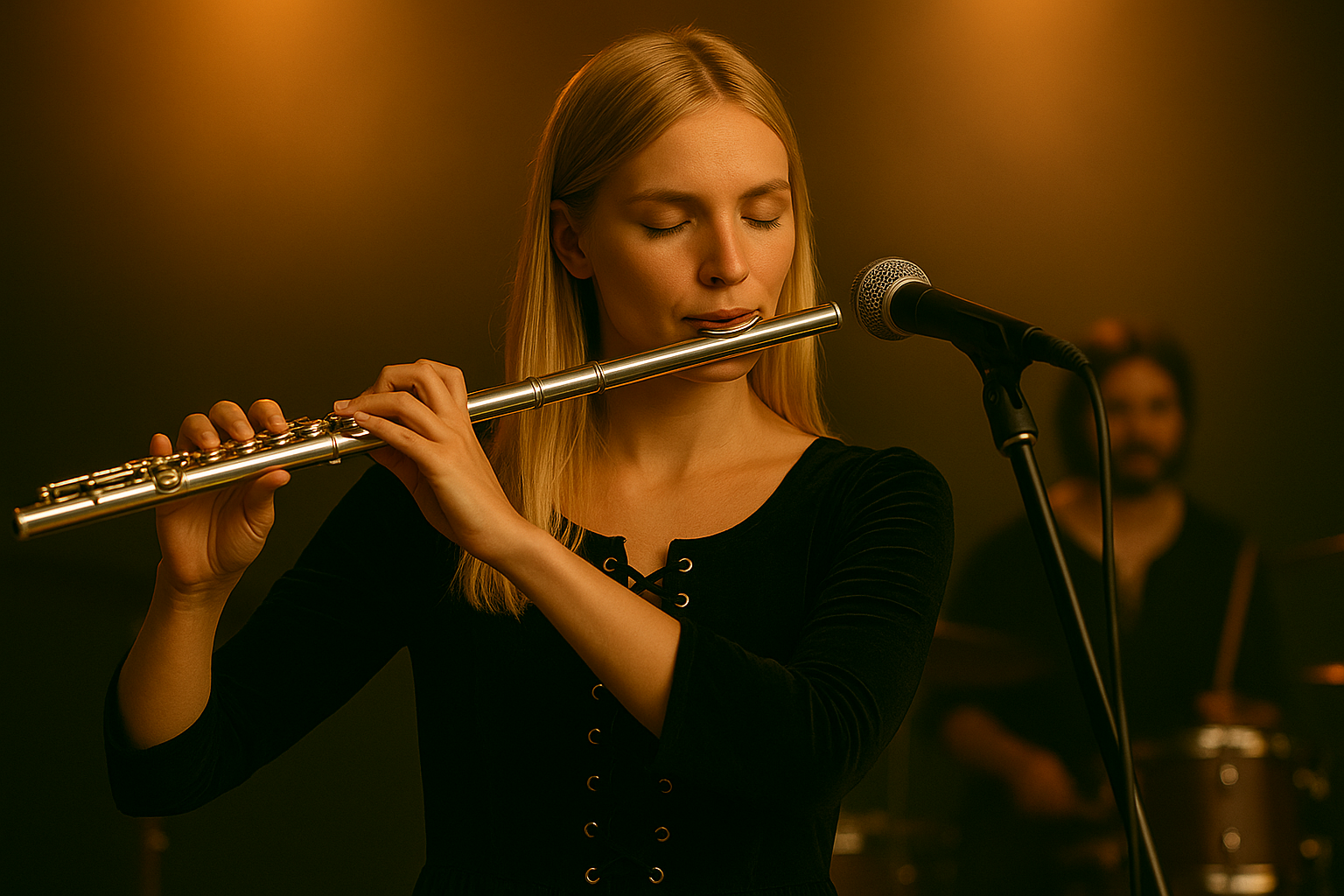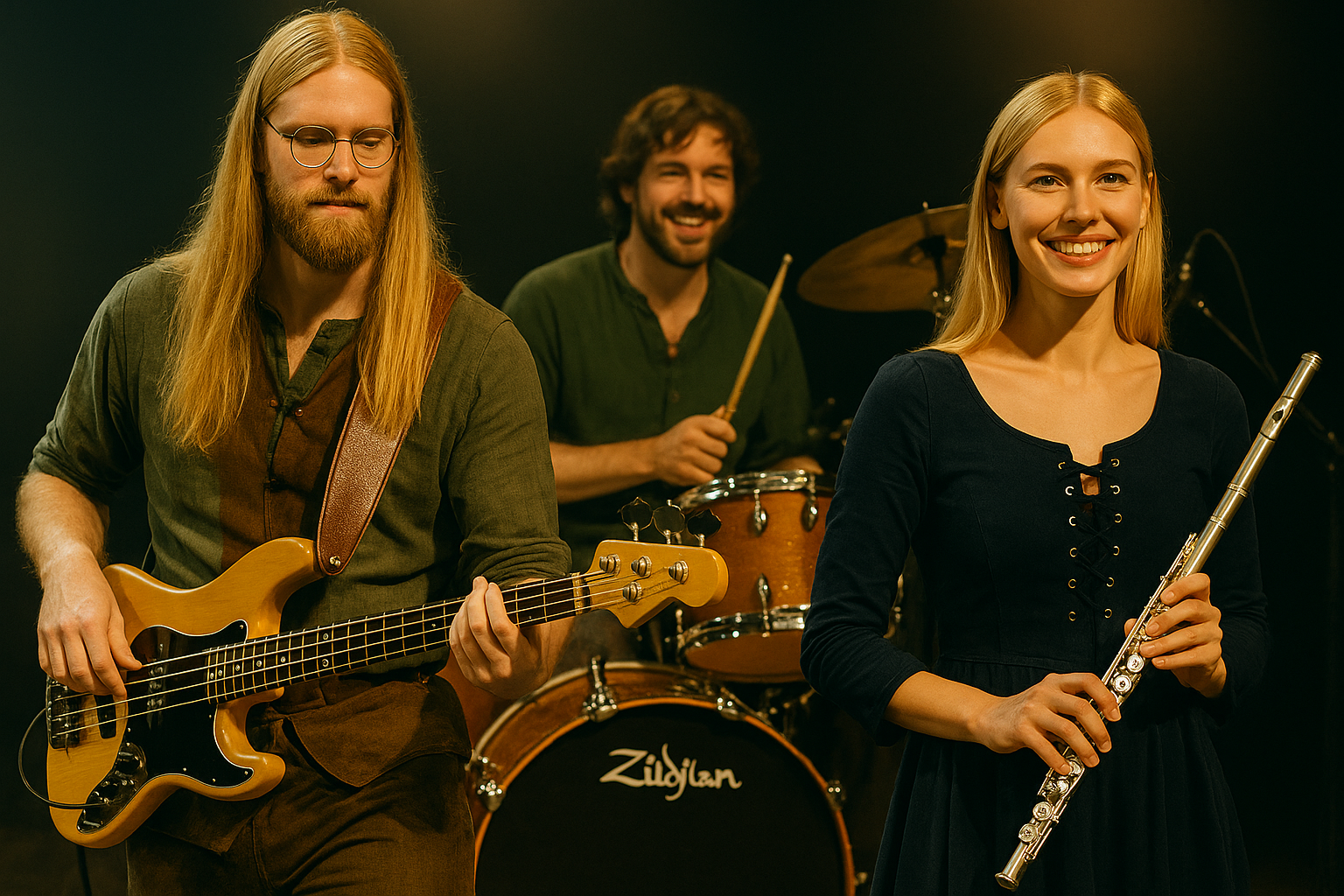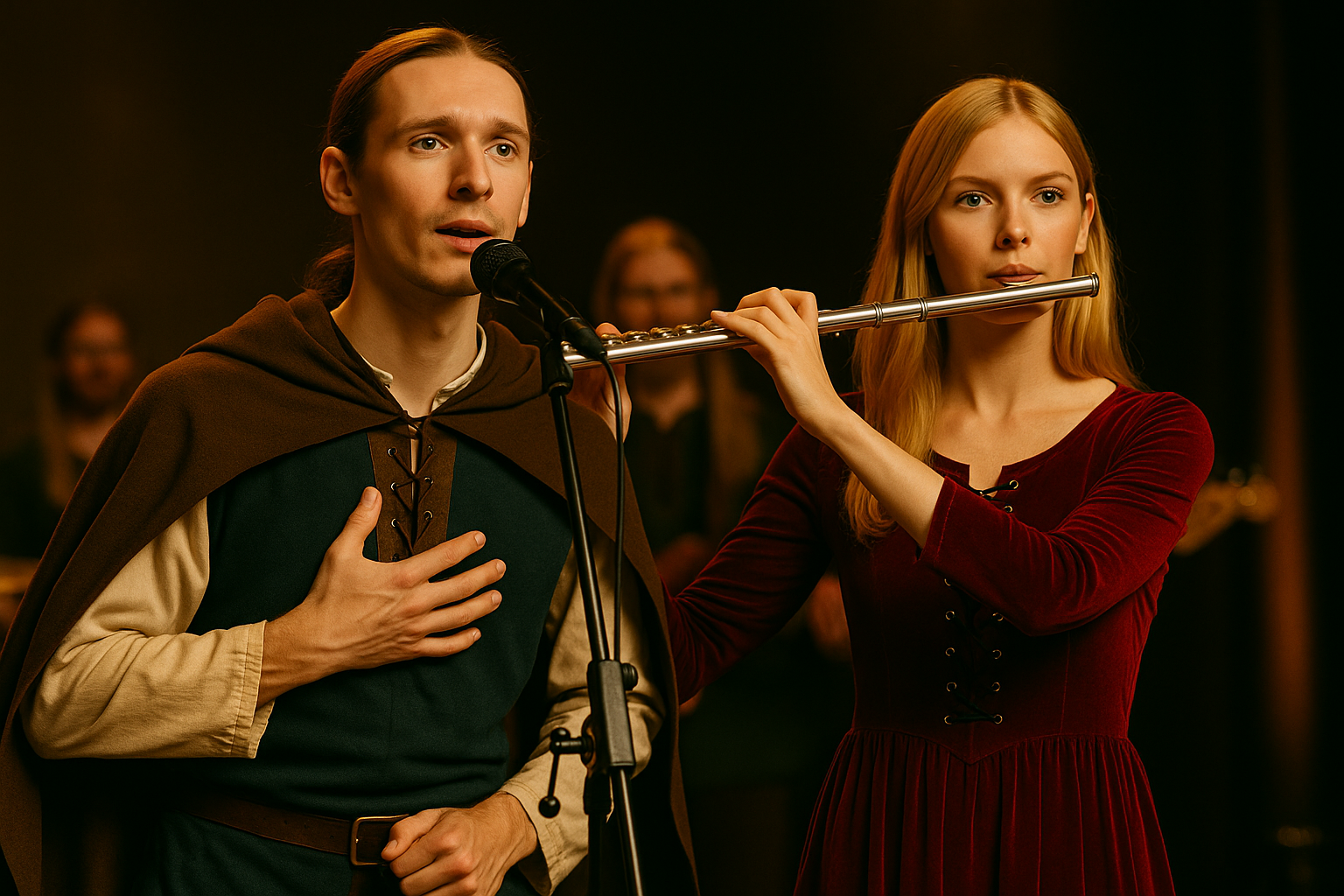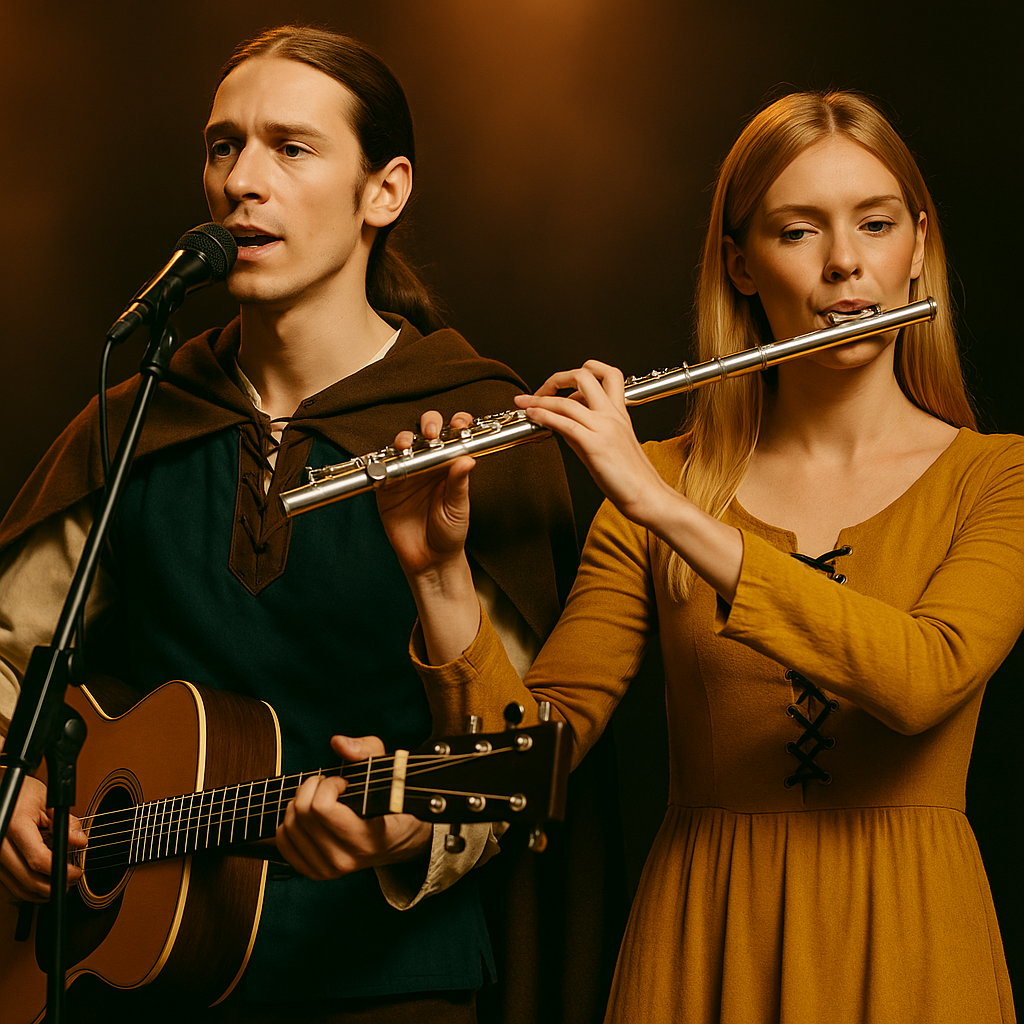 Eva plays flute and sings in Jouste. Her harmony vocals with Ludze, Geoffrey and Nigel can be heard throughout Rise Of The Red King. She also sings lead vocals on Her Majesty's Blues, Pt.1 and The Battle Is One while being featured in Swords Of War and No Battles, Nevermore.