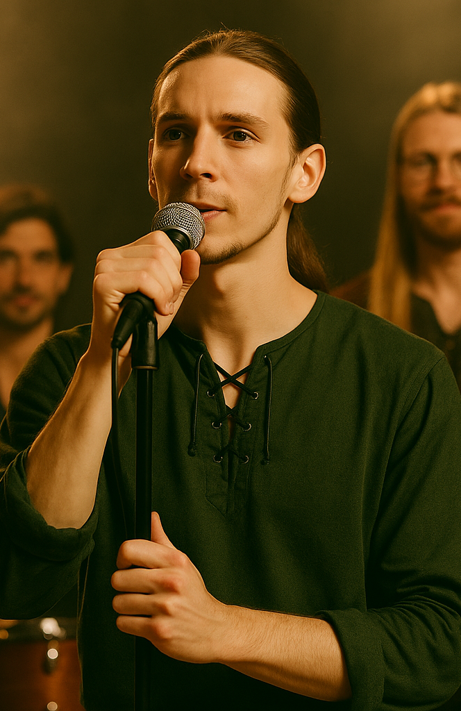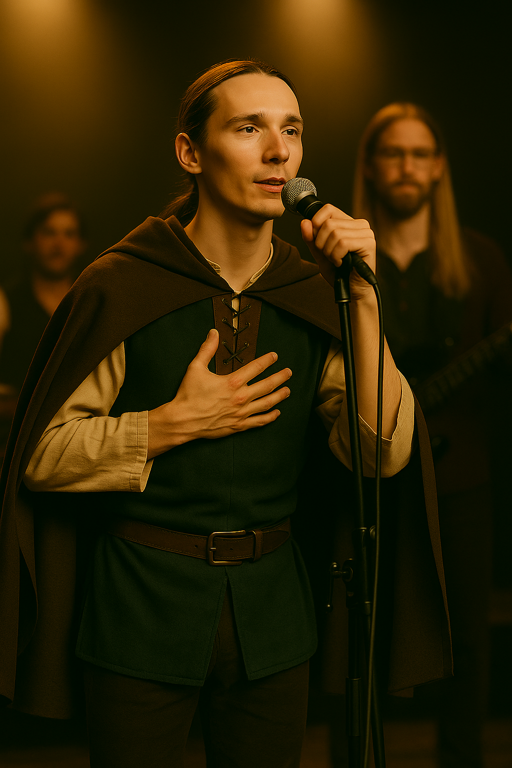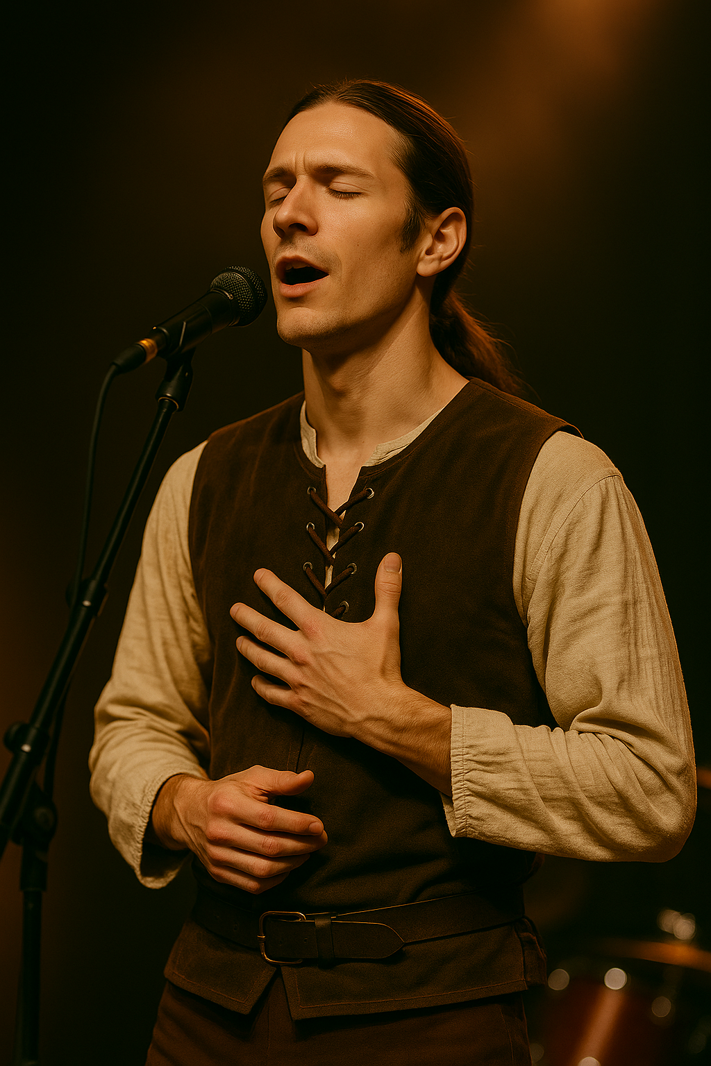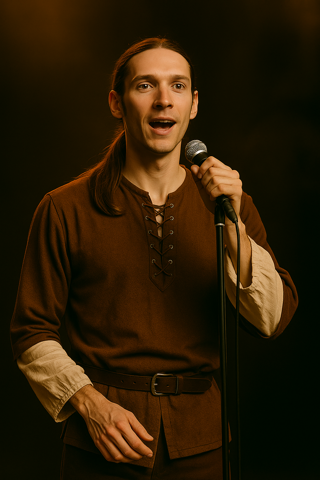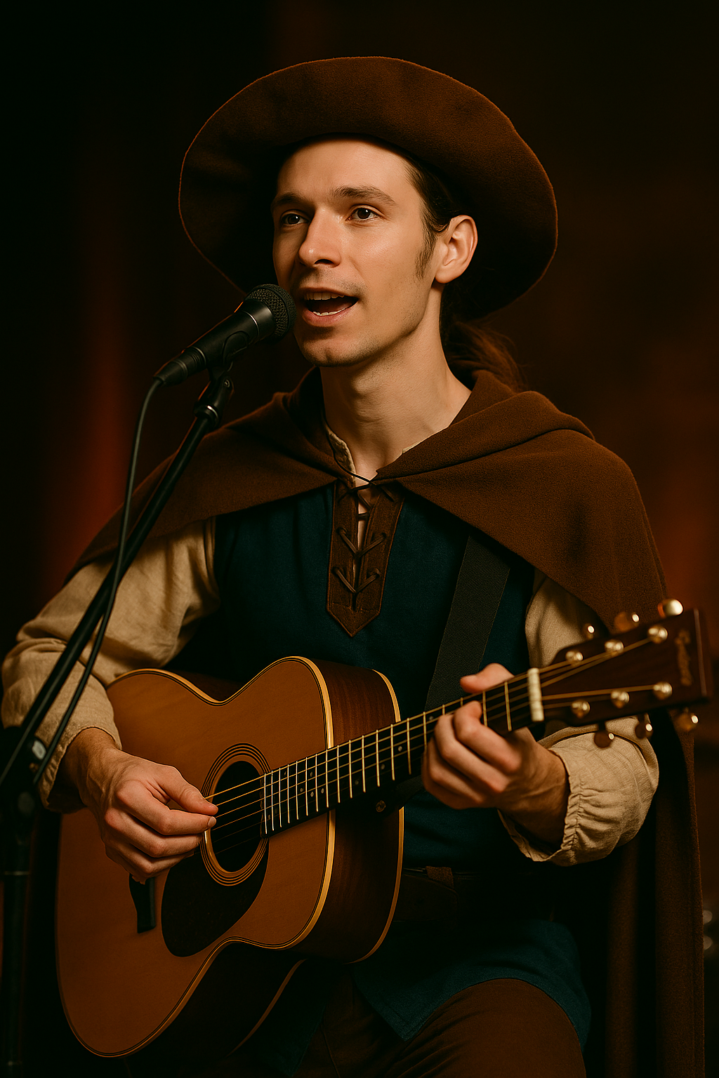 Geoffrey plays the acoustic guitar and sings lead on many Jouste songs. He is the male focal point often playing several characters in Rise Of The Red King. He sings harmony vocals with Nigel, Eva and Ludze while contributing fluid rhythm guitar lines and beautiful Celtic renaissance finger picking solos.