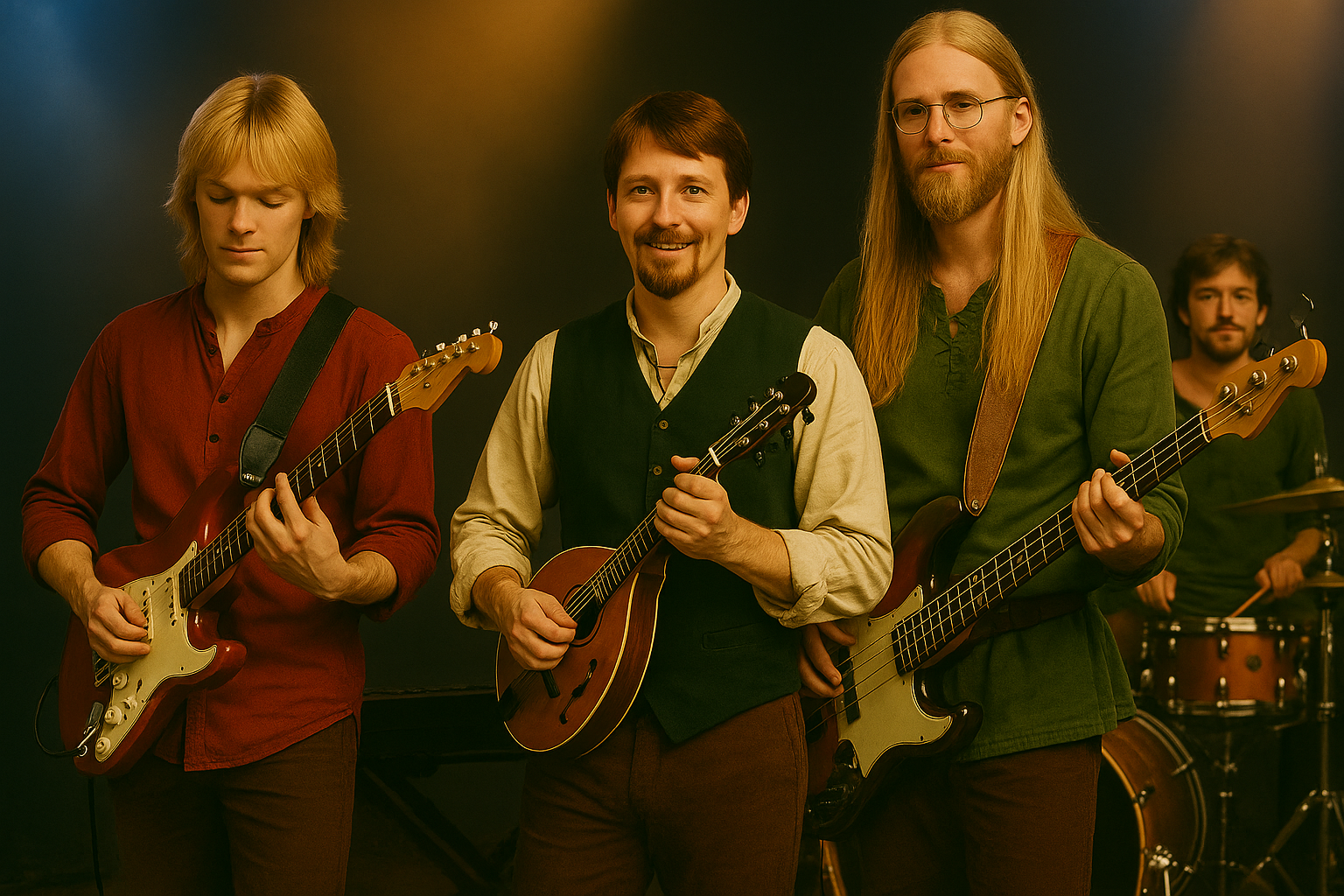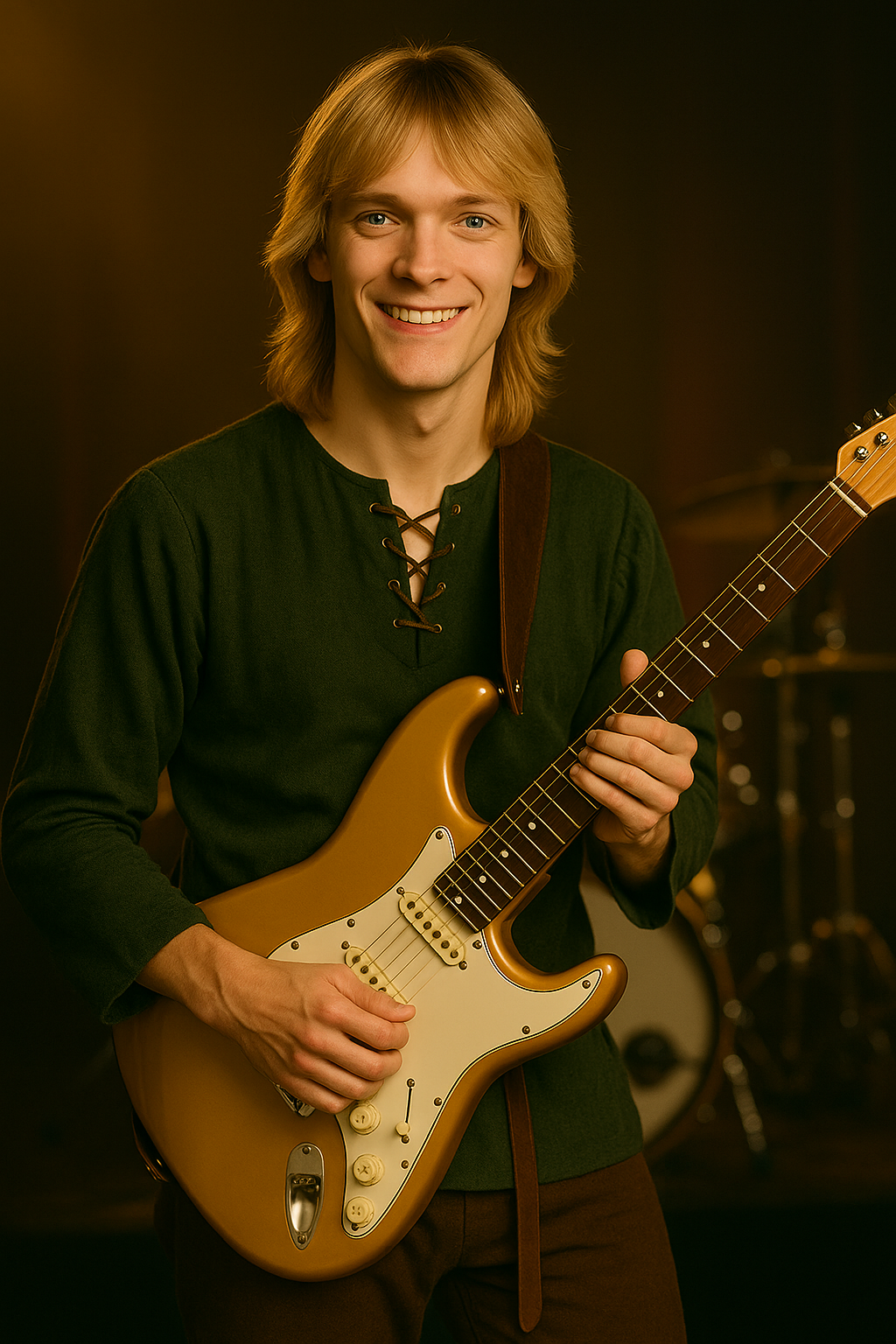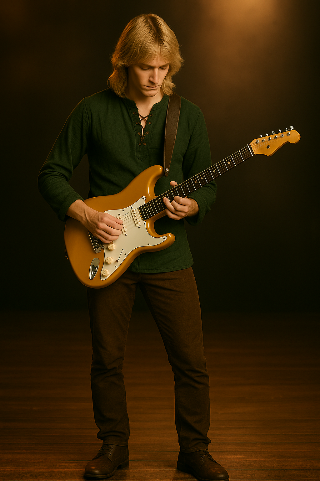 Mick plays guitar for Jouste, both electric and acoustic. His style blends melody and atmosphere, supporting the band’s medieval Celtic and progressive rock sound with versatile rhythm work and expressive classic rock tones.